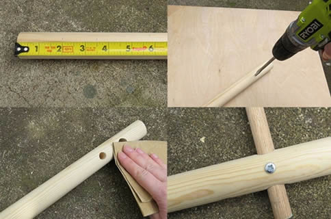 Quando prendete le misure per forare le aste cilindriche in legno, assicuratevi che tutti i fori siano allineati tra loro, per avere una struttura perfettamente squadrata. Su due delle barre da 3 cm di diametro, misurare e fare due segni: uno a 5 cm e uno a 9 cm. Fallo a ciascuna estremità della barra. Sulla terza asta cilindrica da 3 cm di diametro bisognerà fare due segni, entrambi a 9 cm da ciascuna estremità.